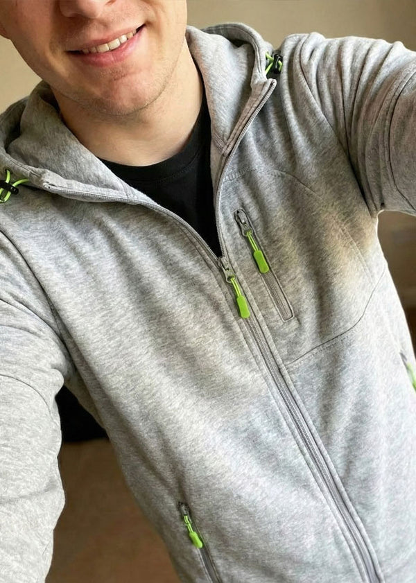 I really like the contrast of the bright blue green on the grey, makes the hoodie look super cool. What I like the most is that it is both light weight and keeps me warm when it is a bit chilly, and at the same time the hoodie is super comfortable and soft from the inside. I highly recommend buying it.